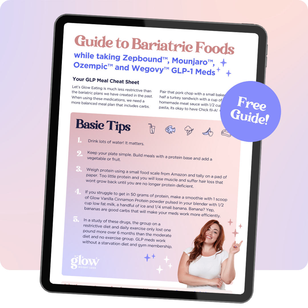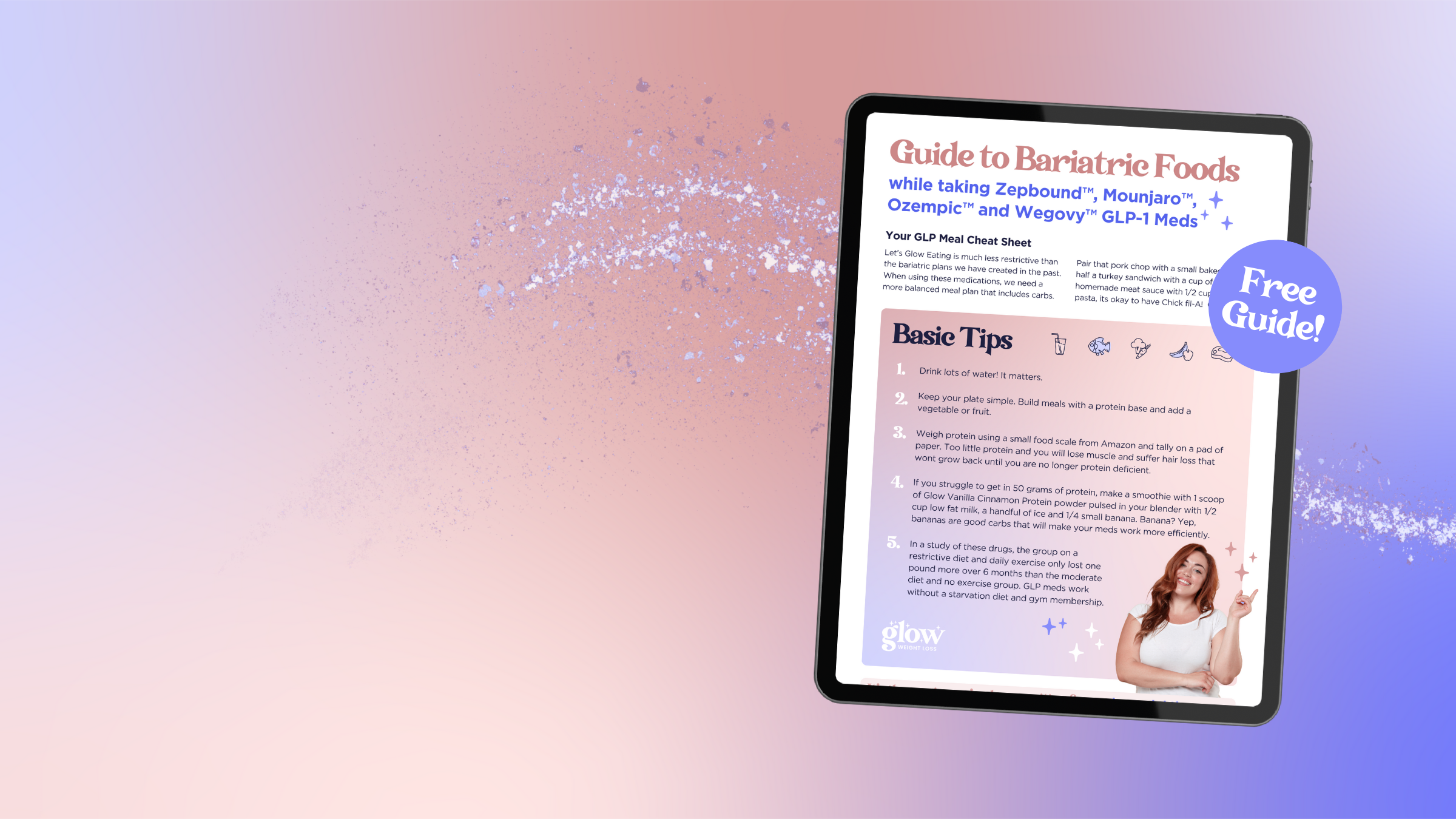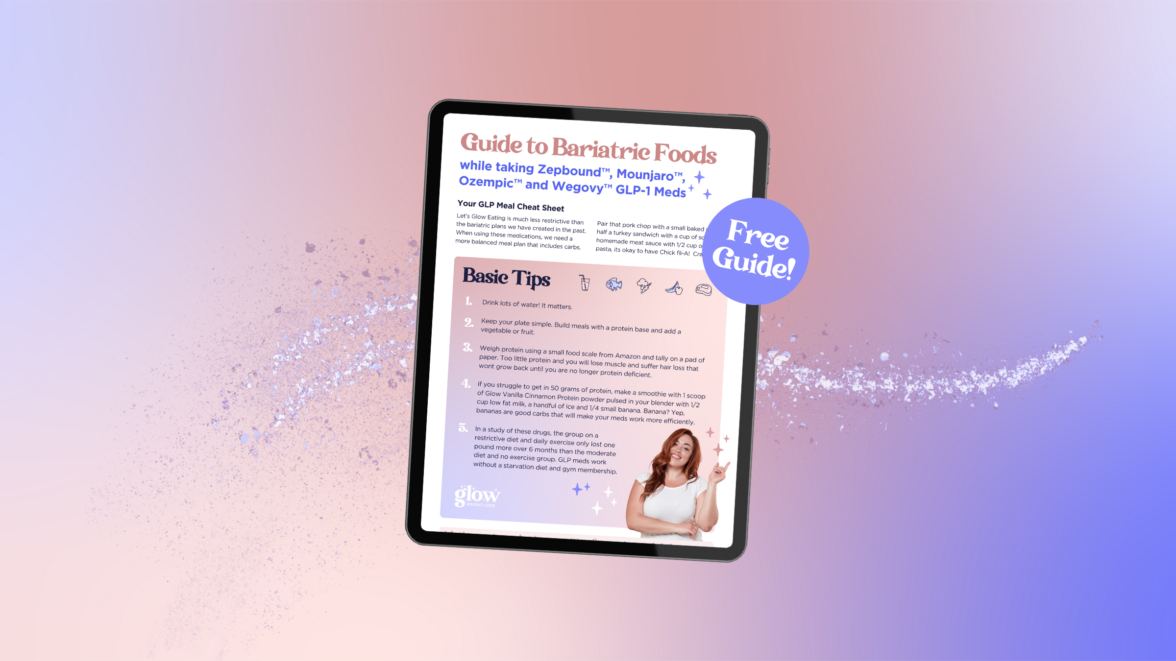 The Glow Guide will show you the Bariatric Style foods to eat while using GLP-1 meds (you’ll be surprised by the foods that are included!) The GLP-1 Meds fix what has been broken inside you.